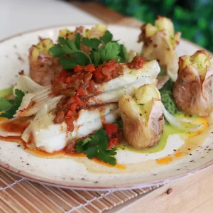 Raia assada com confit de pimentos
