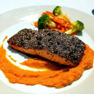 Tranche de Salmão assado com crosta de azeitona e chia
