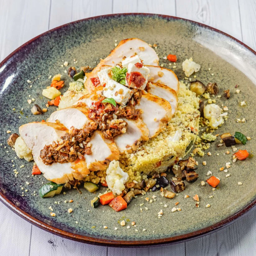 Peito de Frango corado com pesto de manjericão, tomate seco e amendoim, acompanhado por salada de couscous, legumes assados, queijo feta e avelã.